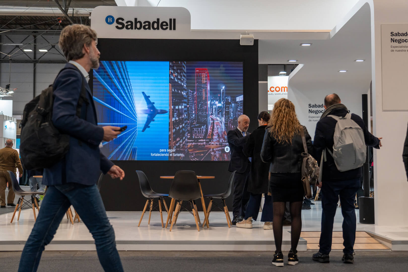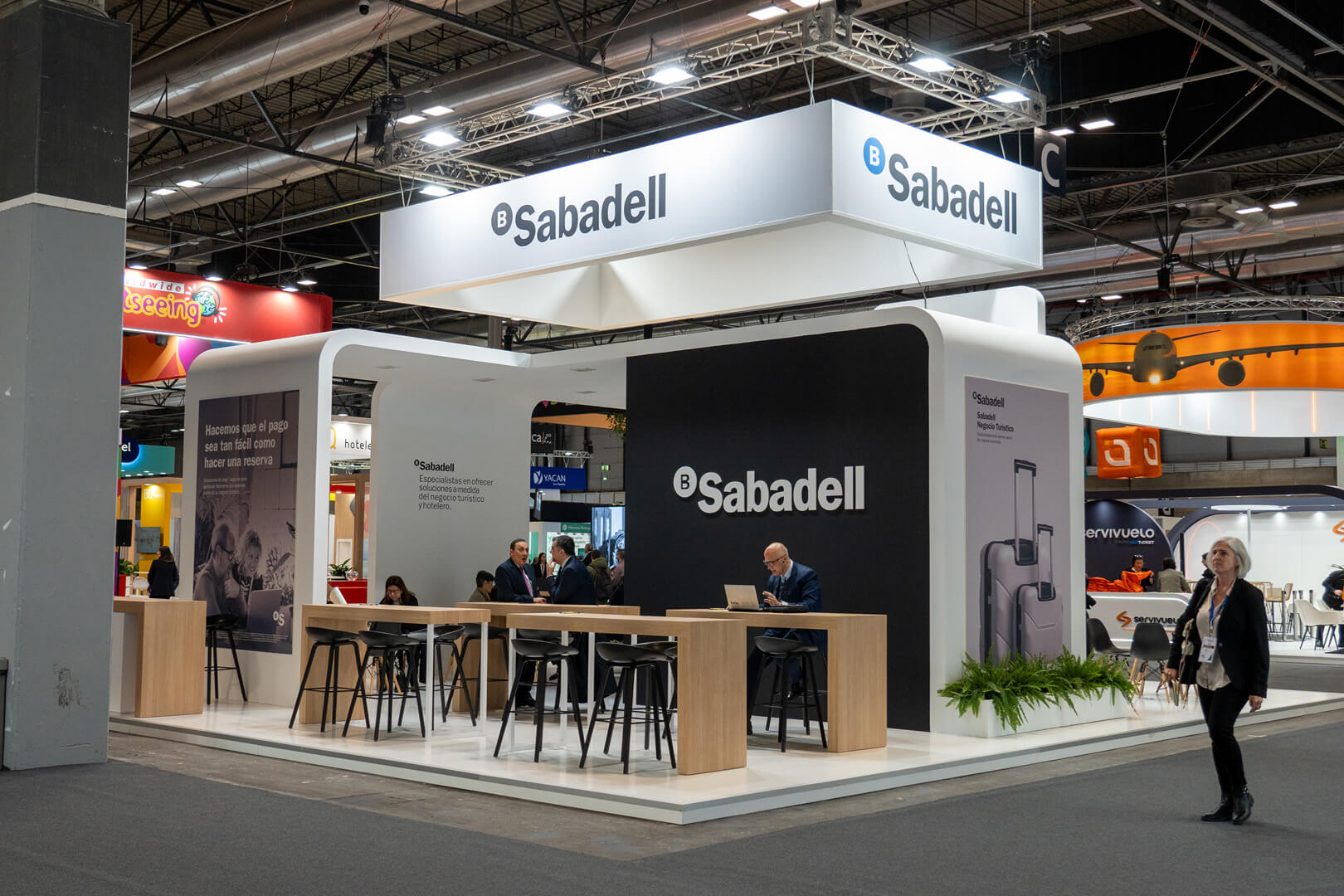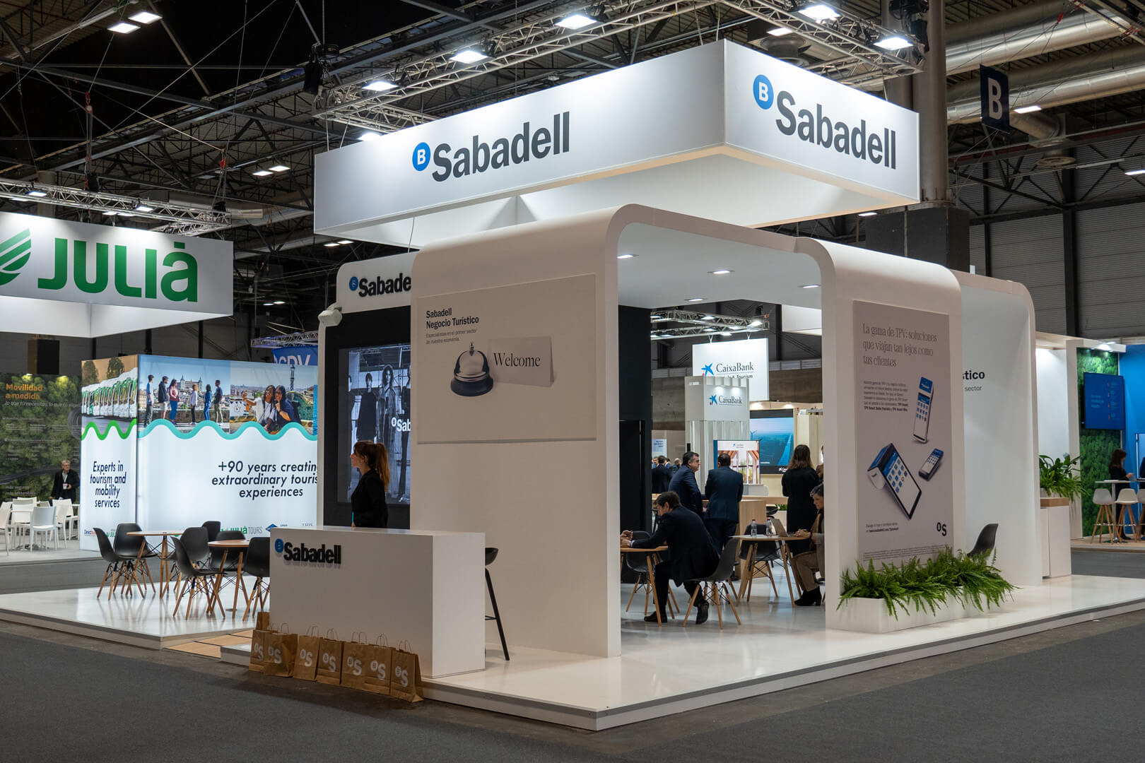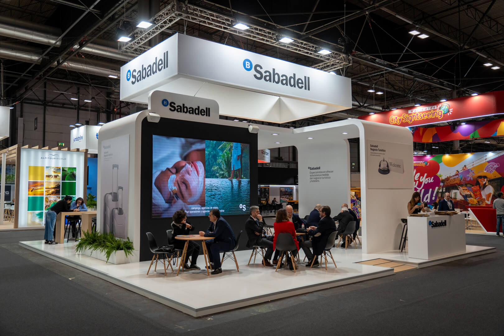 El stand fue concebido como un punto de encuentro para profesionales del sector, donde las oportunidades se materializaban. Con un diseño abierto y líneas elegantes, integramos zonas de networking, áreas de presentación y espacios interactivos donde los asistentes podían descubrir las herramientas financieras que Banco Sabadell ofrece para impulsar proyectos turísticos sostenibles y de alto impacto.